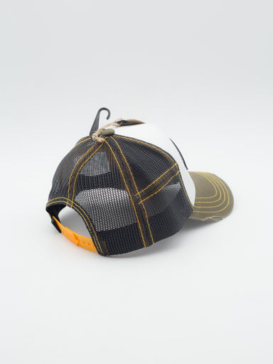 Gorra estilo trucker de Von Dutch Gorra estilo trucker con visera curva Frontal blanco, visera oliva, rejilla negra y costuras amarillas. Visera ...