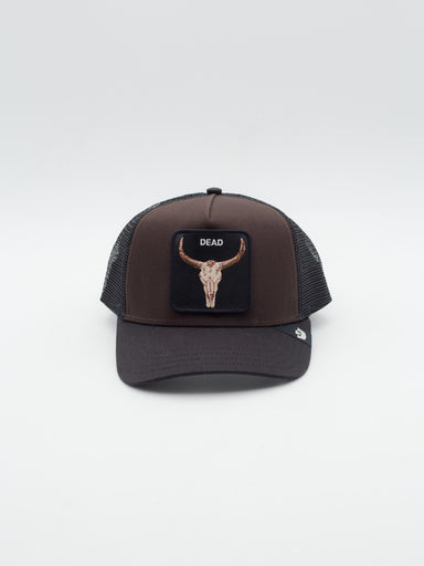 Gorra estilo trucker con parche bordado de Goorin Bros Gorra estilo trucker con visera curva y estructura Frontal marrón y rejilla y visera negr...
