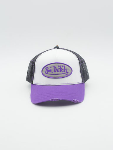 Gorra estilo trucker de Von Dutch Gorra estilo trucker con visera curva Frontal blanco, visera morada y rejilla negra. Visera desgastada Logotipo...