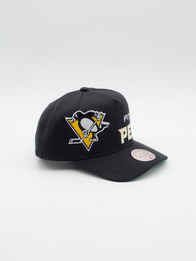 Gorra estilo snapback de Pittsburgh Penguins de Mitchell & Ness Gorra estilo snapback con visera plana Negra y undervisor crema Logotipo "Pitt...