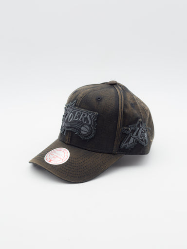 Gorra estilo snapback Pro Crown de los Philadelphia 76ers de Mitchell & Ness Gorra estilo snapback con visera curva Negro desgastado efecto le...