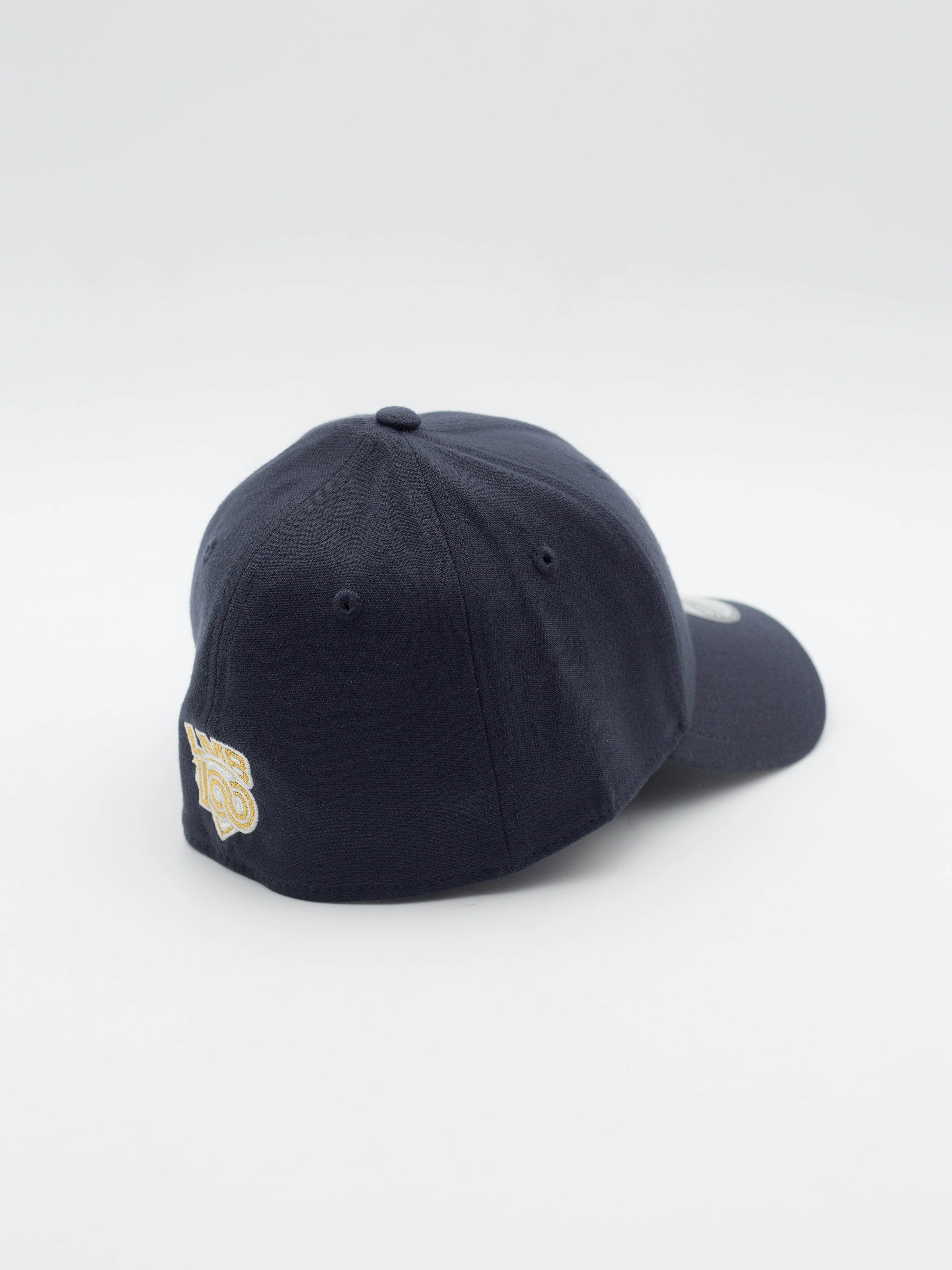 - Logotipo de "Sultanes de Monterrey" bordado en relieve en la parte delantera y "LMB 100 Años" en el trasero con hilo dorado