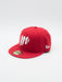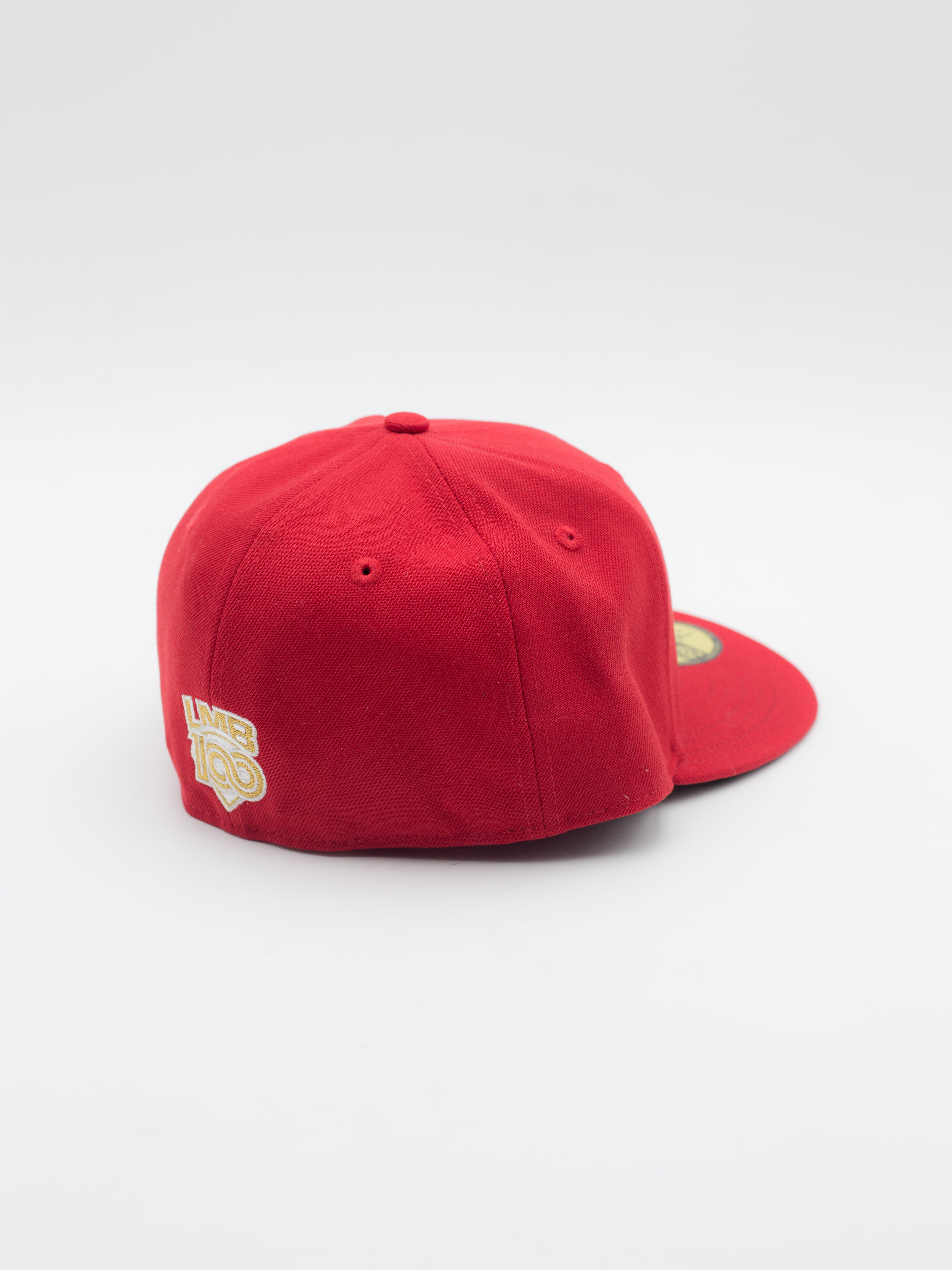 - Logotipo "Diablos Rojos del México" bordado en la parte delantera, logo "100 LMB" bordado en el trasero con hilo dorado y logo "NE" en el lateral