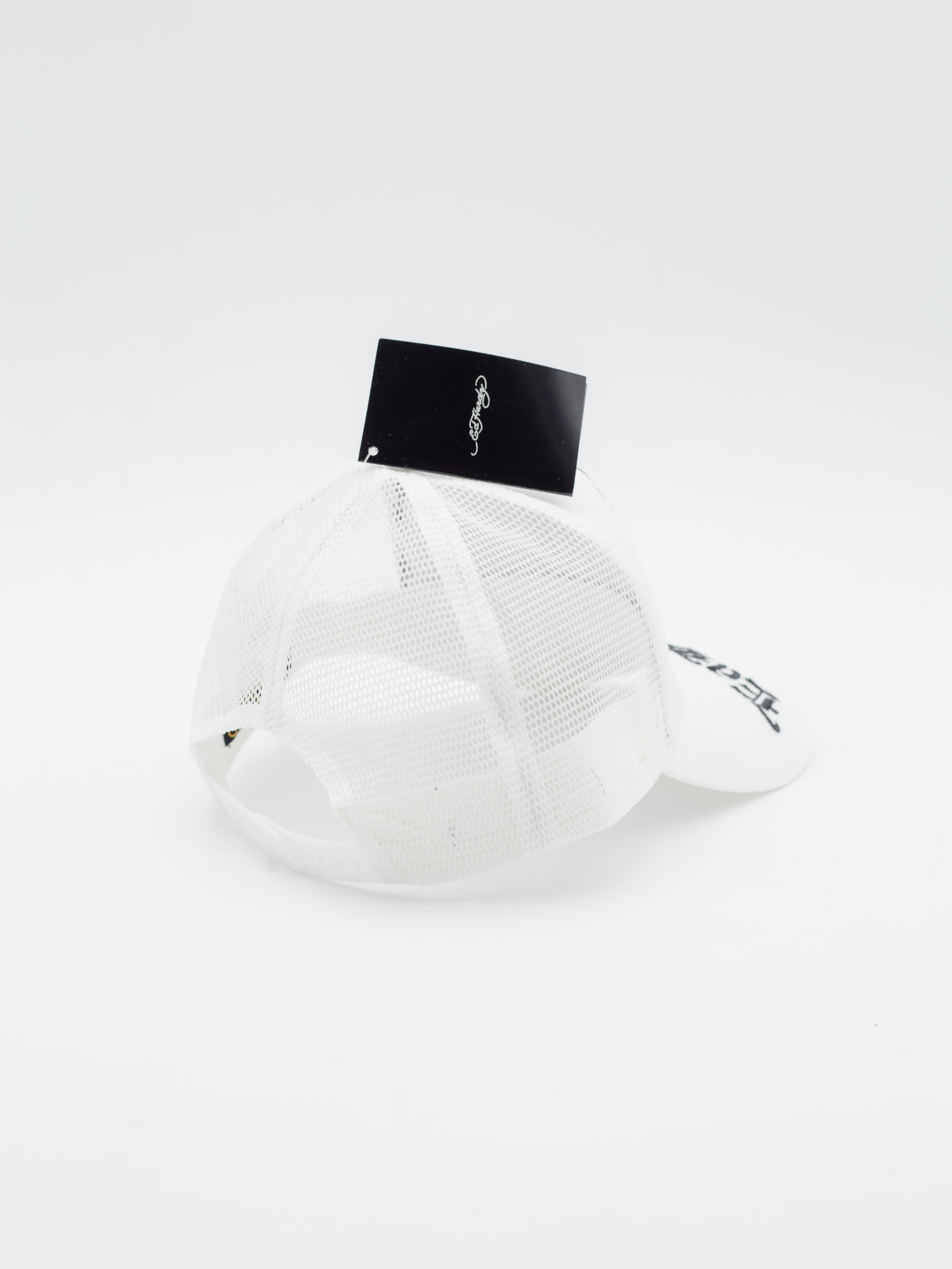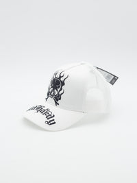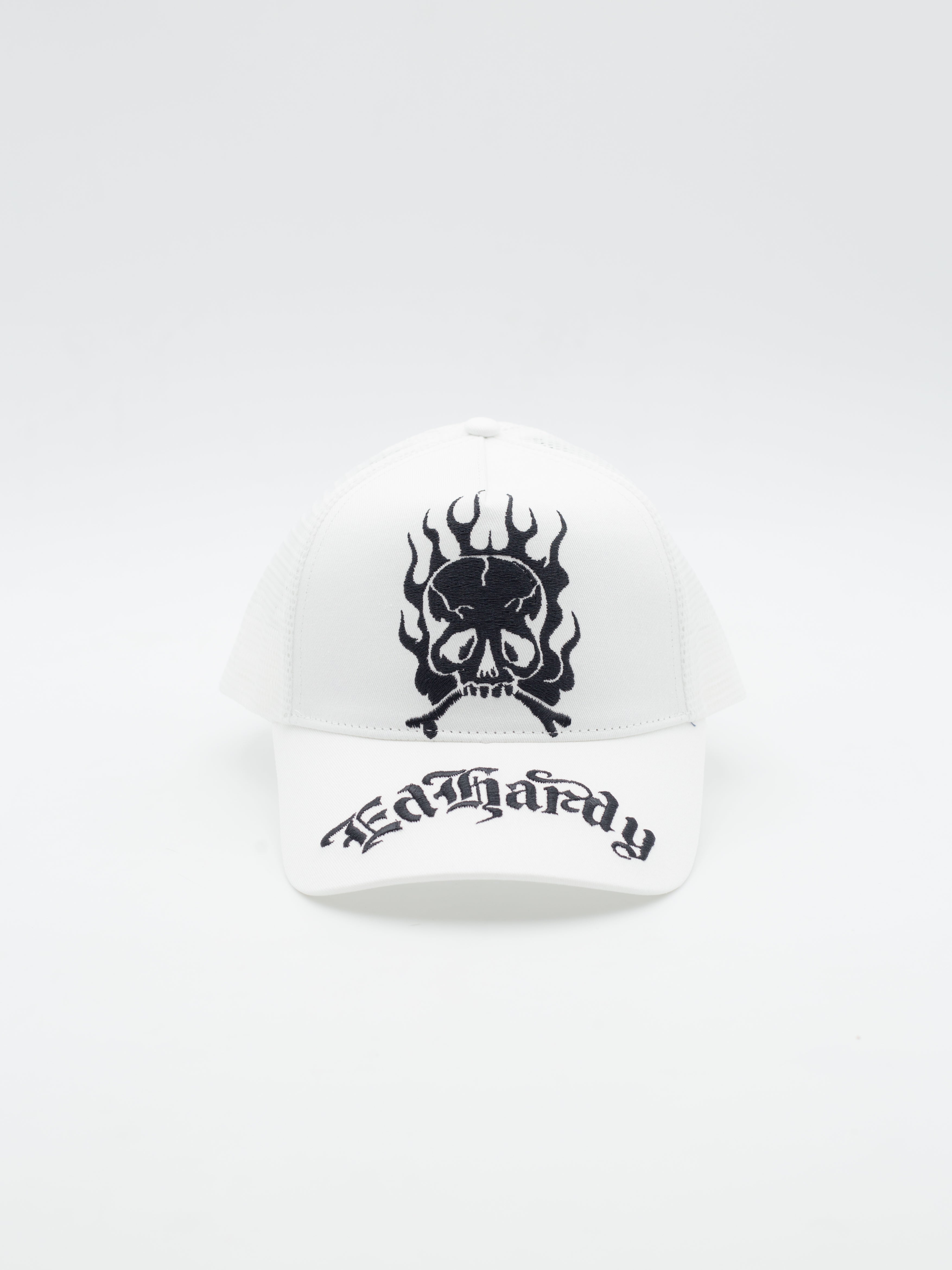 - Bordados de calavera en llamas frontal, la firma del artista tatuador bordado en la visera y lateral.