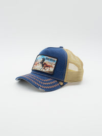 - Frontal y visera de vaquero denim azul y rejilla beige