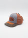 - Frontal denim, visera marrón y pana verde y rejilla naranja